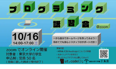 ut.code();は、丁友会と合同で、プログラミング教室を開催します。 丁友会は、工学部・工学系研究科の学生の親睦を目的とした団体ですが、このイベントは東京大...